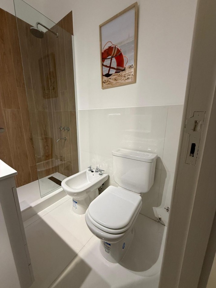 Al ingresar mediante hall de distribución, accedemos al amplio y cómodo living comedor con balcón salida a patio. TV de 43”. Sillón, mesa ratona, mueble para TV, mesa con 4 sillas, lámpara de pie, mueble de apoyo, cortinas Hunter Douglas. En el patio muebles de exterior