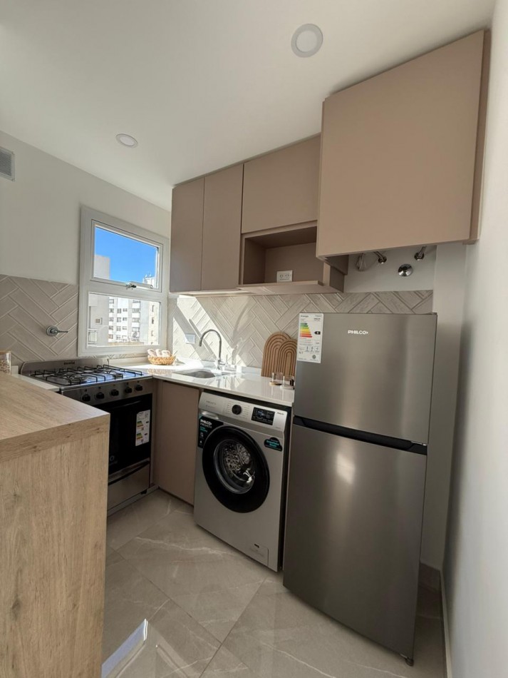 -Cocina integrada con espacio de lavarropas, amoblamiento a medida y barra.