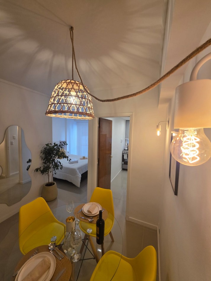 Ambiente dividido con amplio ventanal de piso a techo súper luminoso, cama sommier a estrenar de dos plazas, resplado de cama con mesas de luz incorporadas, mesa con 4 sillas a estrenar, rac con TV Smart 32 pulgadas nuevo, aire acondicionado frio calor, plantas, perchero de pie, cortinas, acolchado y decoración.