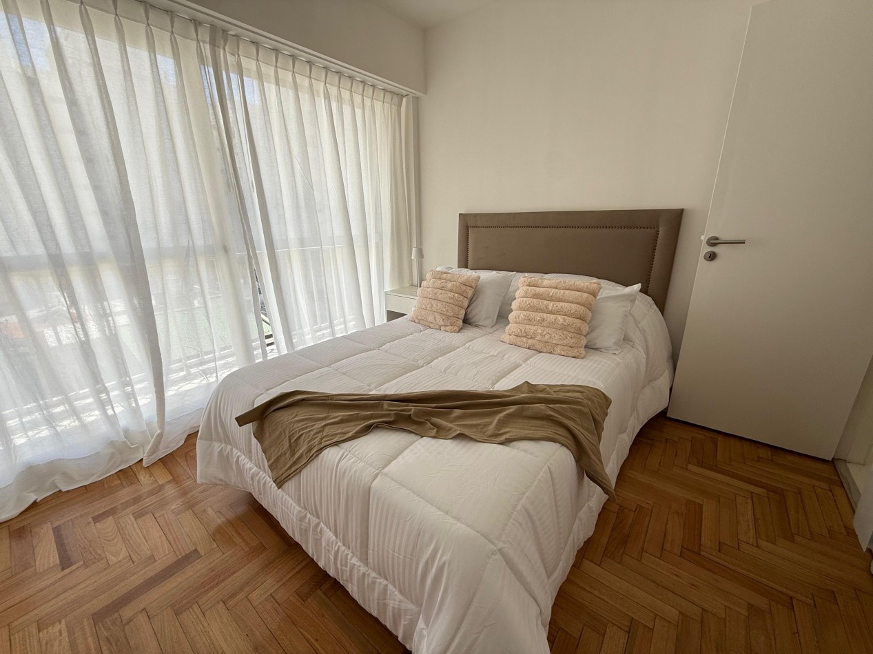 Dormitorio con pisos parquet pulido, lustrado y plastificado, con amplio placard. Con sommier de 2 plazas, respaldo de cama y mesas de luz.