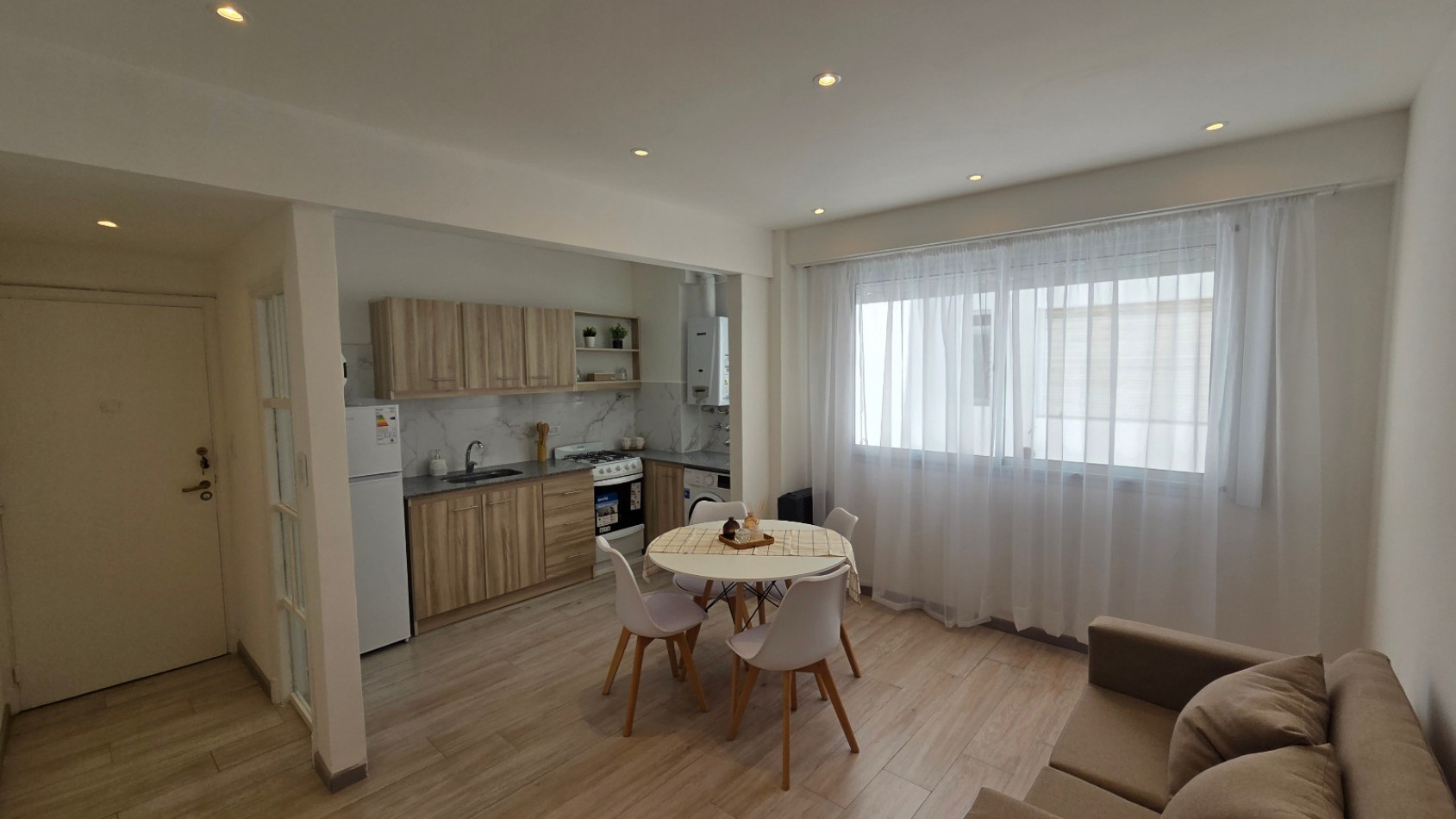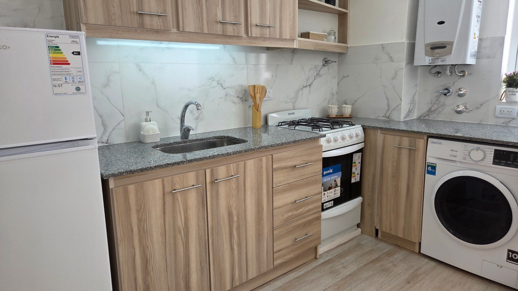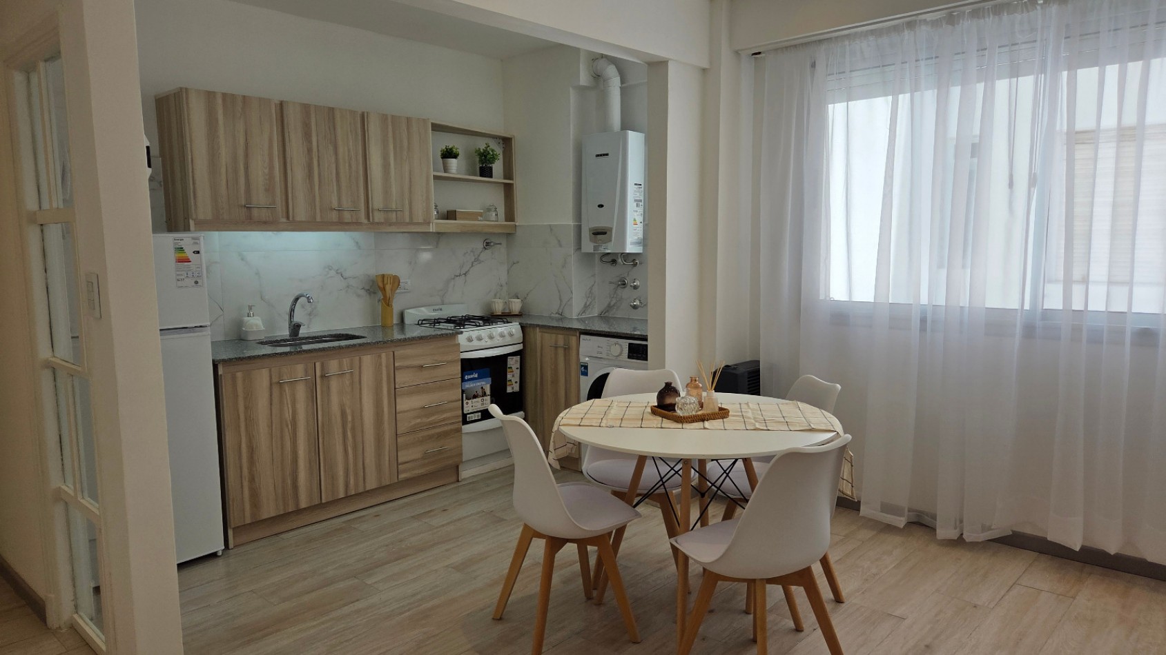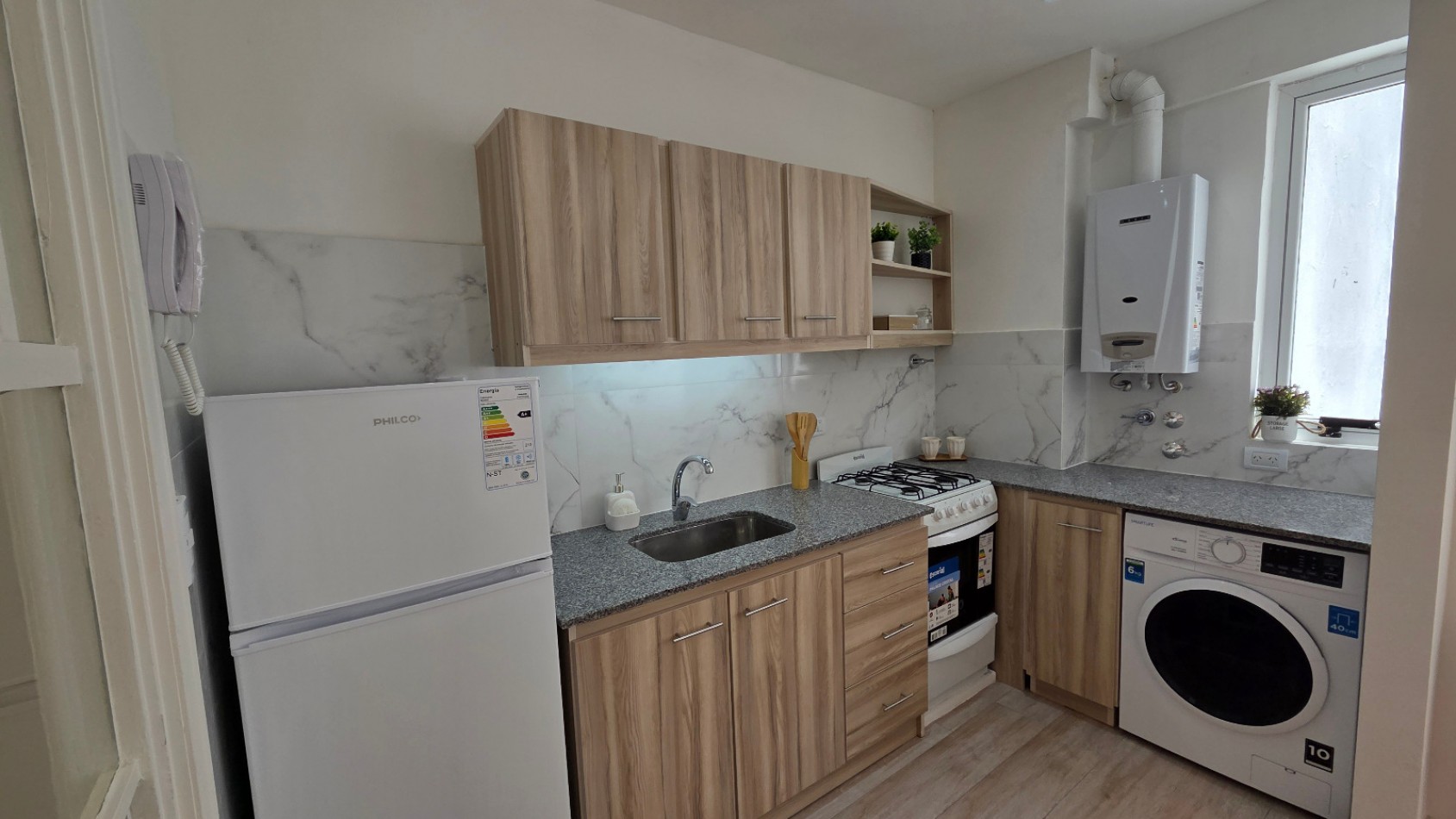 Cocina con ventilación natural, integrada al living, reciclada a nuevo. con lavarropas.