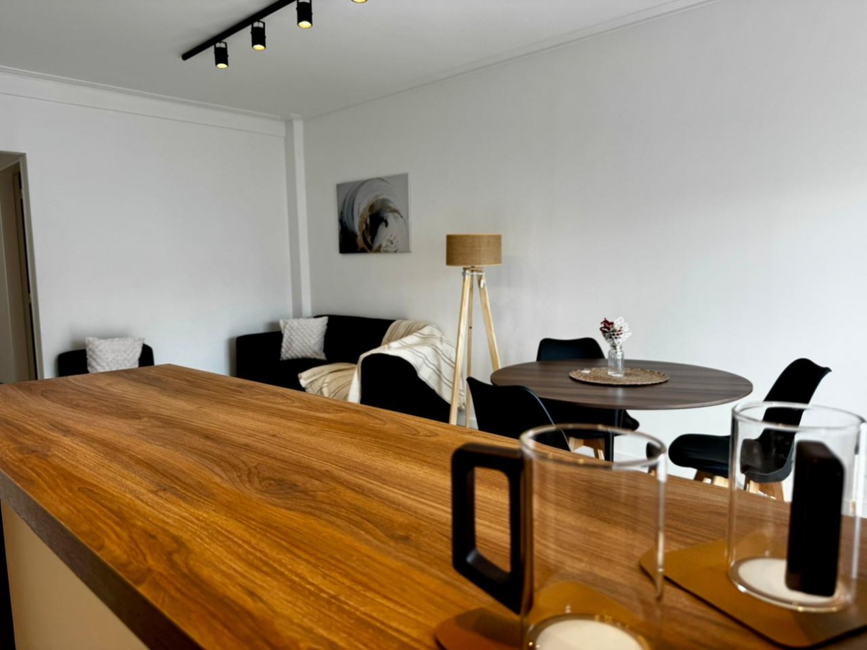 comedor con salida al balcón, cocina integrada con barra desayunadora, dormitorio con