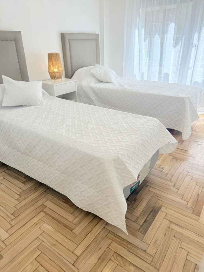 Segundo dormitorio también a la calle con balcón francés, con pisos parquet lustrado y plastificado, con amplio placard con baulera, con dos somier de una plaza, con respaldo, ropa de cama y mesa de luz