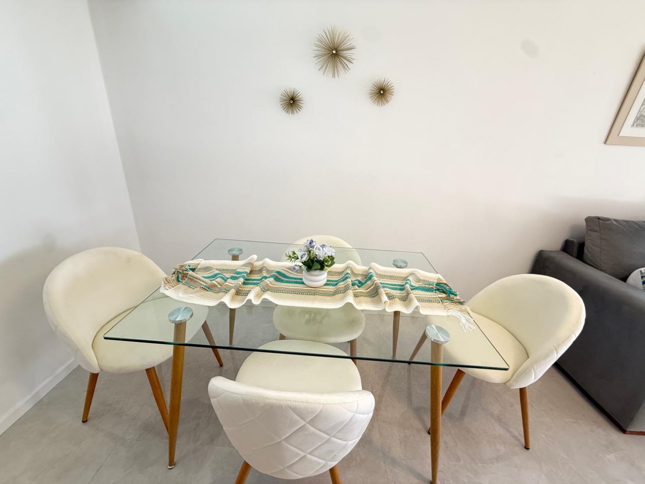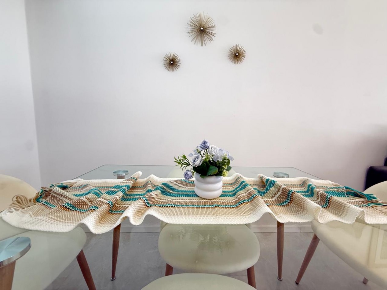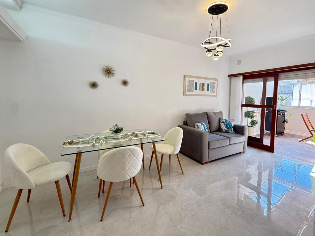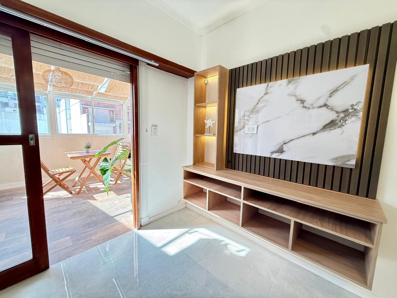 living comedor con porcelanato porto bello , cortinas verticales , rack de diseño c led .