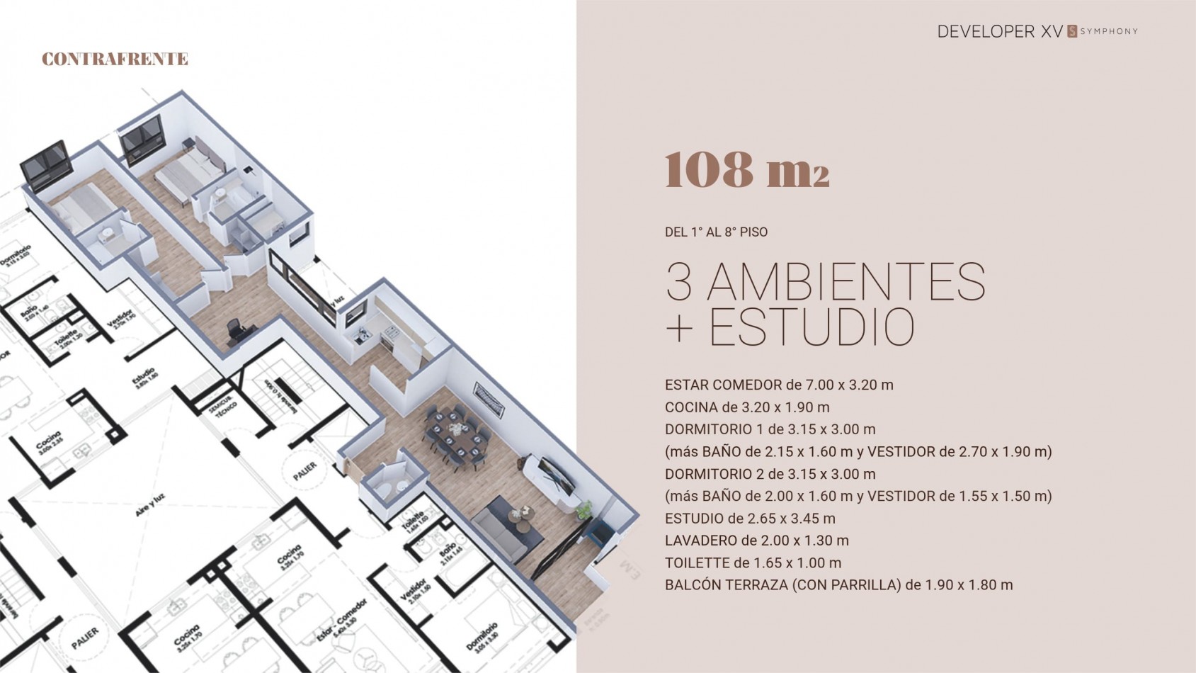 Emprendimiento de categoría en Mar del Plata Developer XV Symphony es un nuevo desarrollo pensado para quienes buscan diseño, confort y calidad de vida en una ubicación estratégica. El edificio ofrece unidades modernas de 2 y 3 ambientes, con excelente distribución y terminaciones de calidad. Cada espacio fue diseñado para brindar funcionalidad y estilo en cada detalle. Cochera y baulera opcionales. Amenities destacados: • Gimnasio totalmente equipado * SUM y quincho para reuniones sociales * Piscina climatizada con solárium Un proyecto que combina arquitectura contemporánea, confort y servicios pensados para disfrutar todo el año.