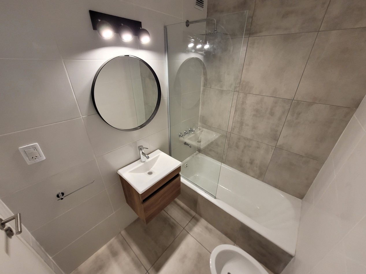 Baño completo con mampara, revestido en cerámicos y con sanitarios a estrenar.