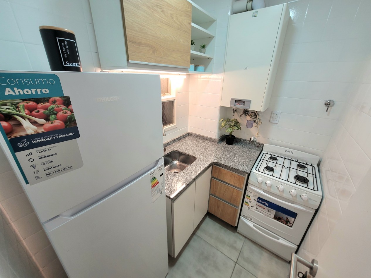 Cocina separada cómoda con heladera con freezer a estrenar, artefacto de cocina a estrenar, calefón Peisa y amoblamientos a medida (mesada, alacena y bajo mesada a estrenar).